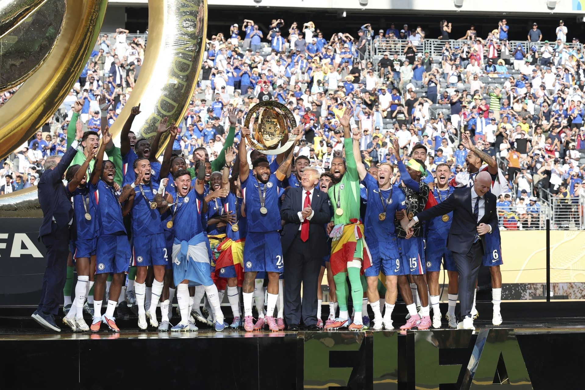Borítókép: A Chelsea játékosai Donald Trump társaságában ünneplik a labdarúgó klubvilágbajnokságon aratott győzelmet / fotó: Eyepix / NurPhoto / NurPhoto via AFP