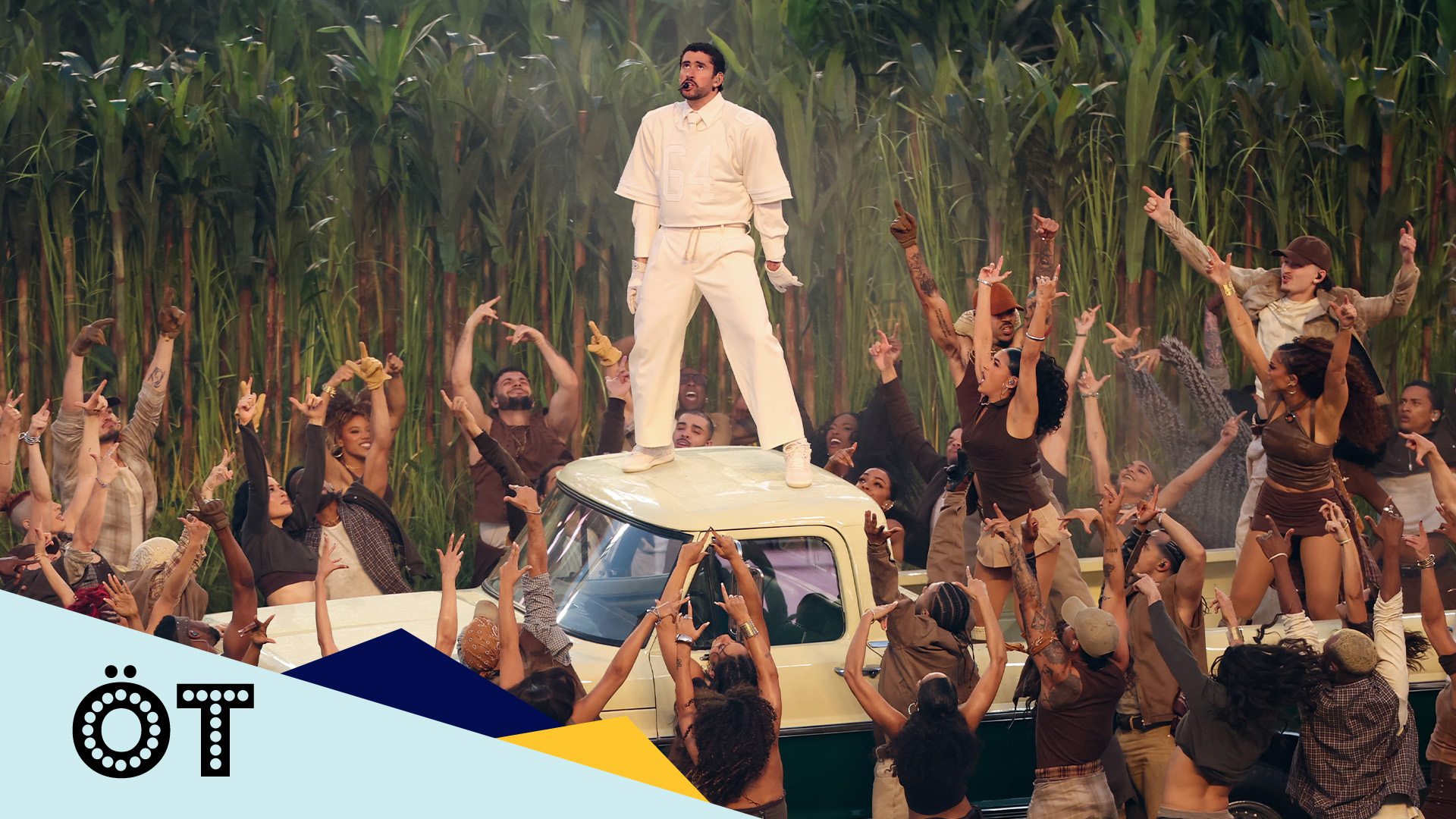 Bunny nem okozott csalódást. Közel kéttucatnyi halftime show-t láttam már életemben – a vasárnapi műsor mint színpadi jelenség a legjobbak között volt. Tizenhárom perc latin fiesta, jól felépített, megkomponált, színes-szagos műsor, az általam korábban nem ismert latin trap igazi „zenei csemege”. A kitűnő táncosok ledérek és kihívók, szigorú konzervatív szemnek nem valók. Még valódi esküvőt is nyélbe ütöttek a színpadon, csak hogy tényleg legyen miről beszélni. Miközben Amerika nézte, Bad Bunny egy cukornádültetvényen sétálva kezdte a műsort. A Tití Me Preguntó („A nagynéni megkérdezte”) című dallal nyitott, közben pedig több Puerto Ricóra jellemző helyszínen haladt el, például egy kókuszvíz-standnál és egy dominóasztalnál. Amikor megérkezett egy házhoz, a nézők több más slágerének mashupját hallgathatták, majd a 90-es és 2000-es évek reggaetonja előtt tisztelegtek, mindezt két srác villámgyors tánca körítette. A Monaco című szám vezette fel a rövid esküvői rituálét és boldogító igen kimondását, miközben a tévéképernyőn is láthatóvá vált a stadionban kivetített Concho, egy animált karakter, aki a szigeten veszélyeztetett fajnak számító Puerto Ricó-i tarajos varangyot (sapo concho) képviselte. Concho nem hivatalos kabalája Bunny Grammy-díjas albumának, és a Puerto Ricó-i identitást képviseli, egyben rávilágít a sziget környezetrombolásának veszélyeire. Ezután következett a show csúcspontja: Lady Gaga csatlakozott a salsa zenekarhoz a Die With a Smile című dalban egy olyan színpadon, amely a Puerto Rico fővárosában, San Juanban található óvárosi El Morro erődítményt idézte – ez volt az a pillanat, amikor a Levi’s Stadionban jelen lévő közönség többsége talán együtt énekelhetett. Aztán Ricky Martin elénekelte a Lo Que Le Pasó a Hawaii („Mi történt Hawaiival”) című dalt.