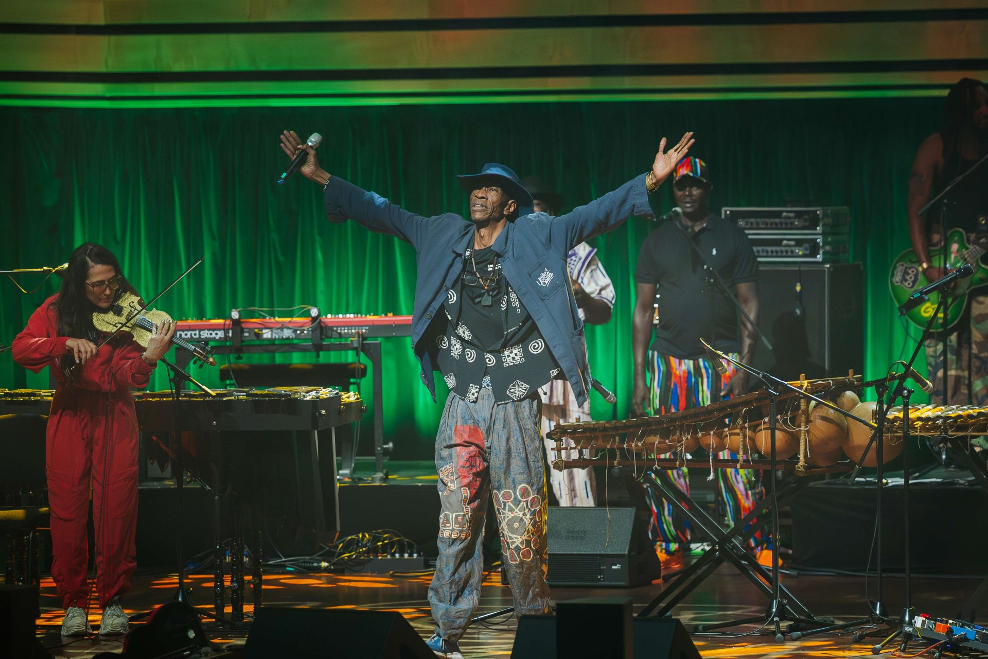 Arra azonban ez az este is felhívja a figyelmünket, ha különféle kulturális tartalmakat öntünk egybe, az még nem garancia a minőségre. A multikulti sincs meg jó dalok nélkül. Még a mexikói rezesekkel táncba hívó világzenei lakodalmas sem. Voltak persze remek pillanatok: az Imarhan-frontember, Sadam, a Joan As a Police Women néven zenélő, ezen az estén főleg hegedűn játszó Joan Wasser, valamint Damon Albarn közös desert blues-dala például egészen elragadó és felemelő volt, de emlékezetesek voltak az afro-hiphopos percek, nehezen felejthető a dél-afrikai Moonlight Sanelly színpadra lépése, vagy a búgó baritonnal bájoló mexikói transznemű énekesnő, Luisa Almaguer figurája és egynémely produkciója sem. Utóbbiról jegyezte meg mögöttem egy néző, hogy milyen jó lenne egy Almodóvar-filmben. Egyetértek, és emelem: én egy David Lynch-moziban is bírnám, kár hogy itt már csak visszamenőleg működhet a képzelet. És akkor ott volt még a kalapos madárijesztőre emlékeztető Jupiter Bokondji, akiről az ember egyszerűen csak nem tudta levenni a szemét.