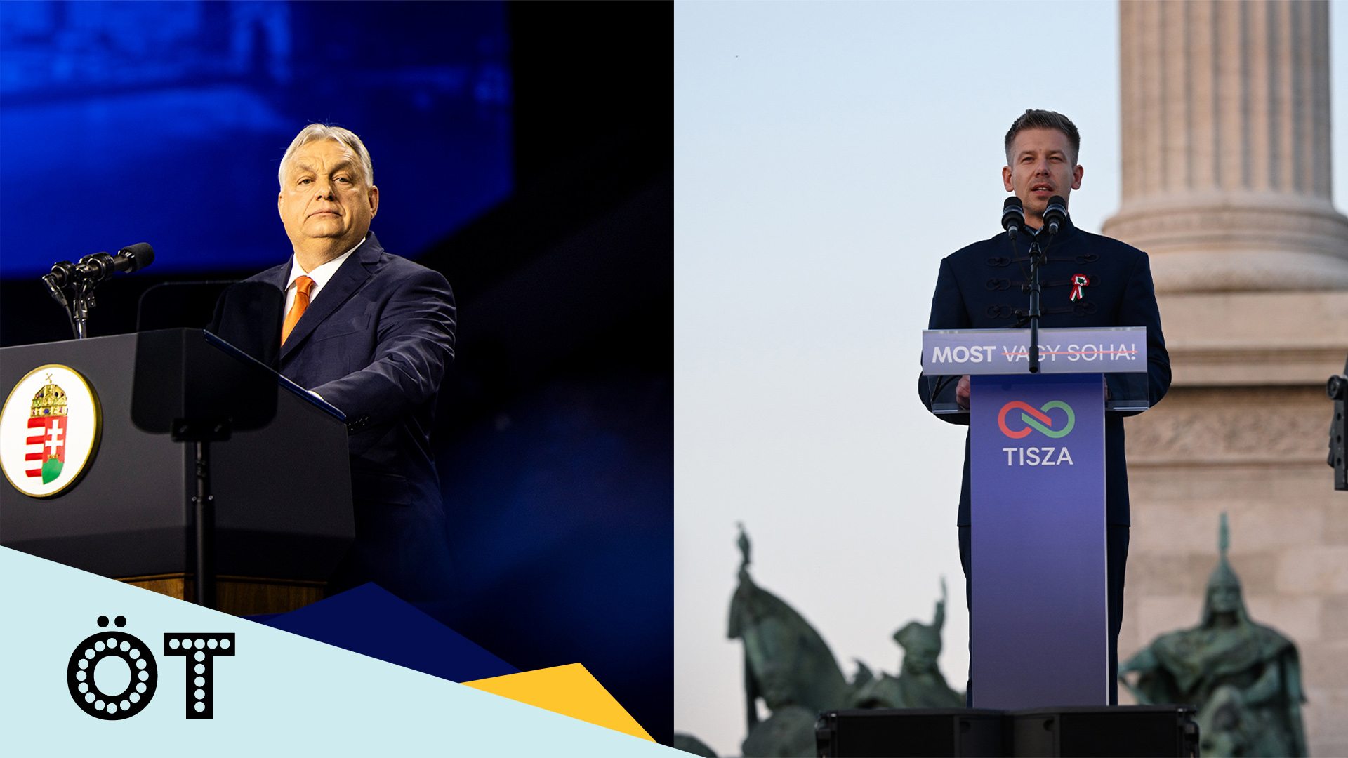 Borítókép: Orbán Viktor a magyar-amerikai barátság napja alkalmából rendezett nagygyűlésen az MTK Sportparkban 2026. április 7-én / fotó: MTI/Miniszterelnöki Kommunikációs Főosztály/Fischer Zoltán | Magyar Péter a Hősök terén 2026. március 15-én. / fotó: MTI/Hegedüs Róbert