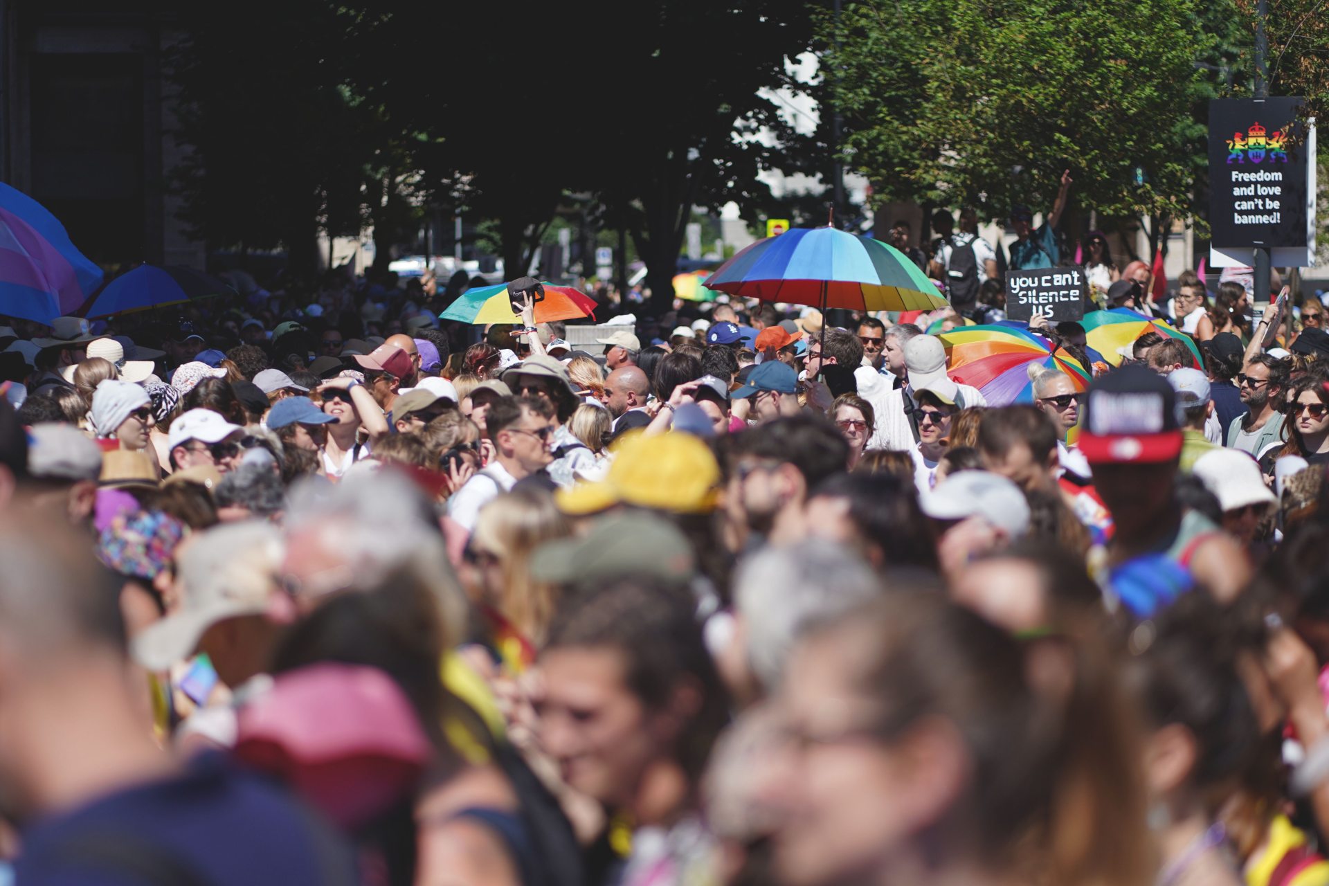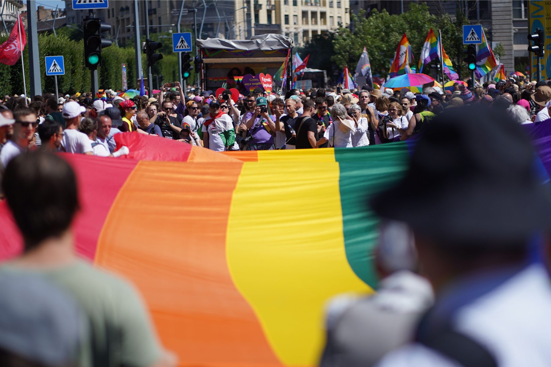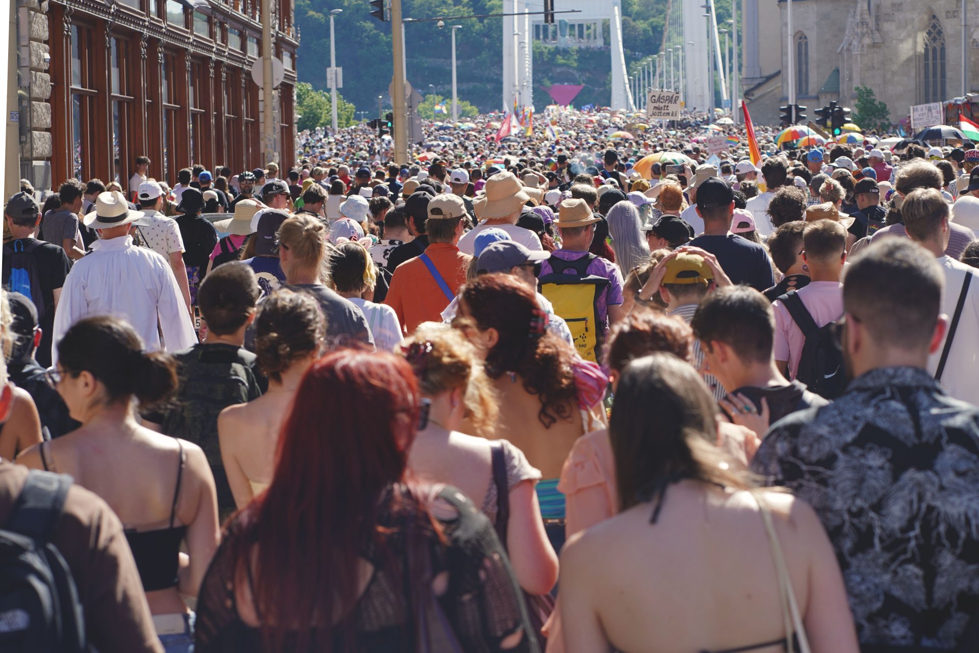 Tamásékkal keresünk egy árnyas gesztenyefát, közben összeismerkedem Zolival, aki elmondása szerint divattervező Londonban. Megdicsérem a szettjét, kicsit olyan, mintha Gandalf Pokolgép-rajongó lenne, de még épp az irónia innenső oldaláról. Eszter pedig egy emberre firkál üzenetet, aki hirdetőoszlopnak van felöltözve, de ez egyáltalán nem biztos. Félóra múlva már alig lehet elférni a téren, az árnyékról lemondok, inkább megpróbálom felkutatni azokat a kétes elemeket, akiket homofób ismerőseim vizualizáltak a kocsmában előző nap. Csalódnom kell: se színpadon kefélő leszbikus lányokat, se egymást pórázon vezető félmeztelen férfiakat nem látok, pedig annyira figyelek, hogy belesajdul a szemgolyóm. Ellenben egy Surda-kalapos férfit igen, aki „A poloskák átteleltek” feliratú pólóban kortyolgatja nyugodtan nehéz sörét. Gondolom ő az ellenpont, bomlasztani jött, vagy majd a csatában lesz valami stratégiai szerepe, ami a hírek szerint az Astoriánál készülődik. Kémeink jelentik, hogy a tömeg eleje már ott tart, de mi még meg sem mozdulunk. Ahogy be tudjuk lőni a helyzetünket, nagyjából a vonulók felénél lehetünk, később teljesen elvesztem tér- és időérzékemet.
